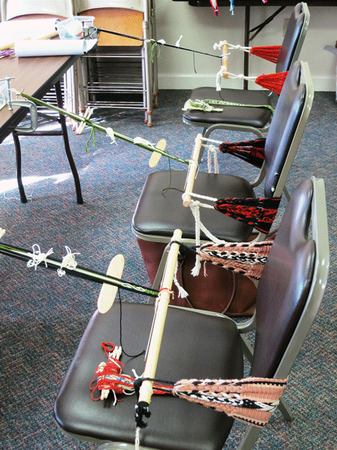 We used C-clamps on tables to hold one end of our warps and dowels and backstraps to hold the other end to our bodies.