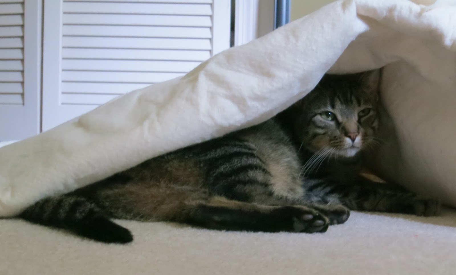 On Sunday morning, I prepared a fourth warp, but I didn't get to work on it until I got home. Luckily, once home, Oliver took over Laverne's job and kept a close eye on my tension: